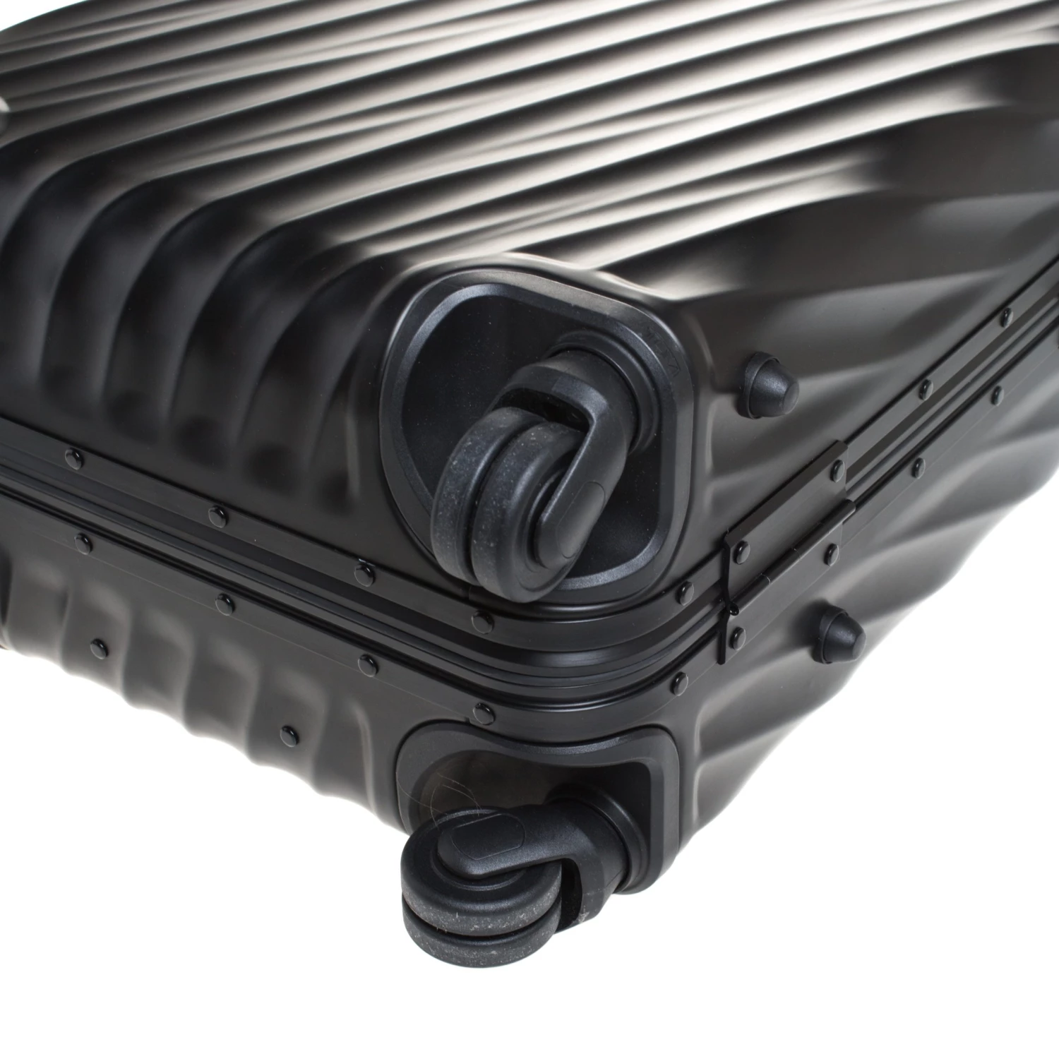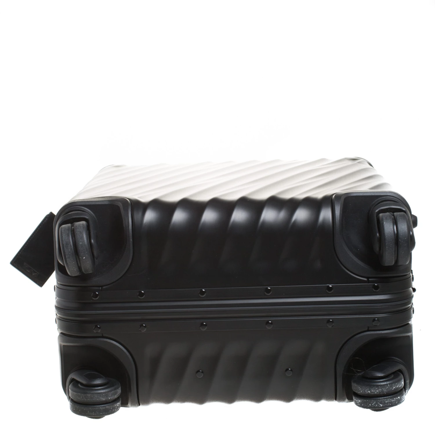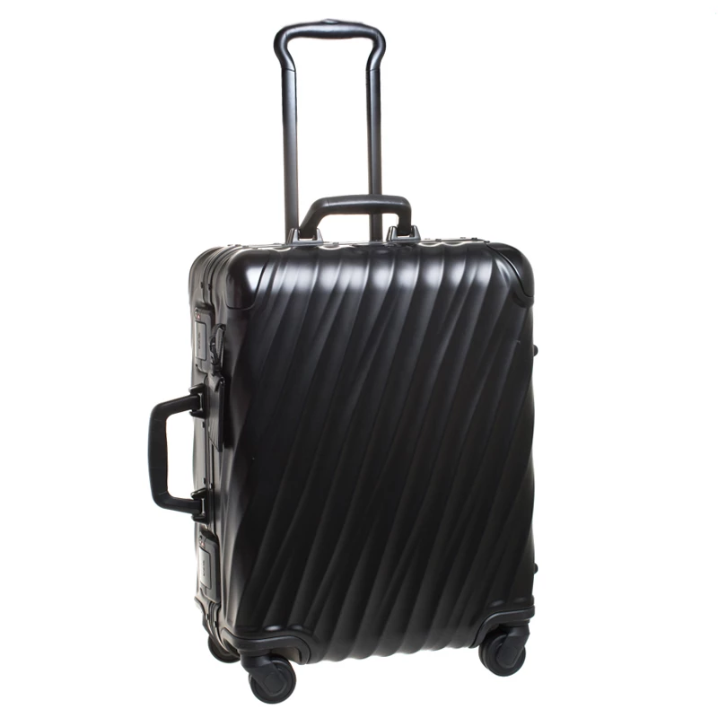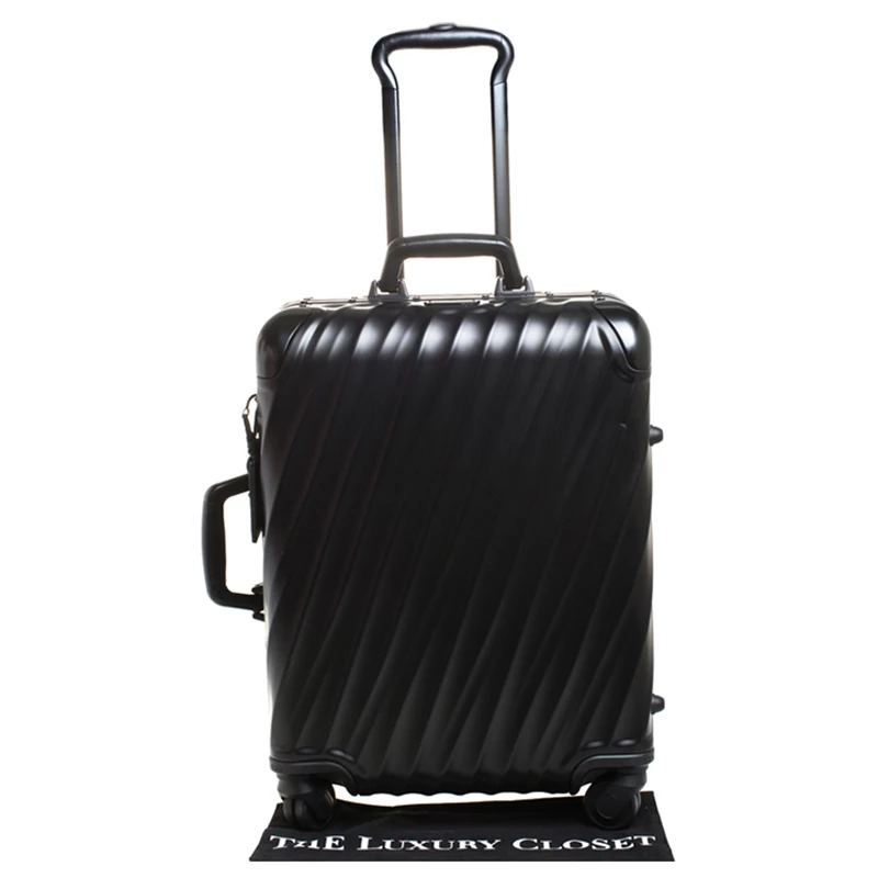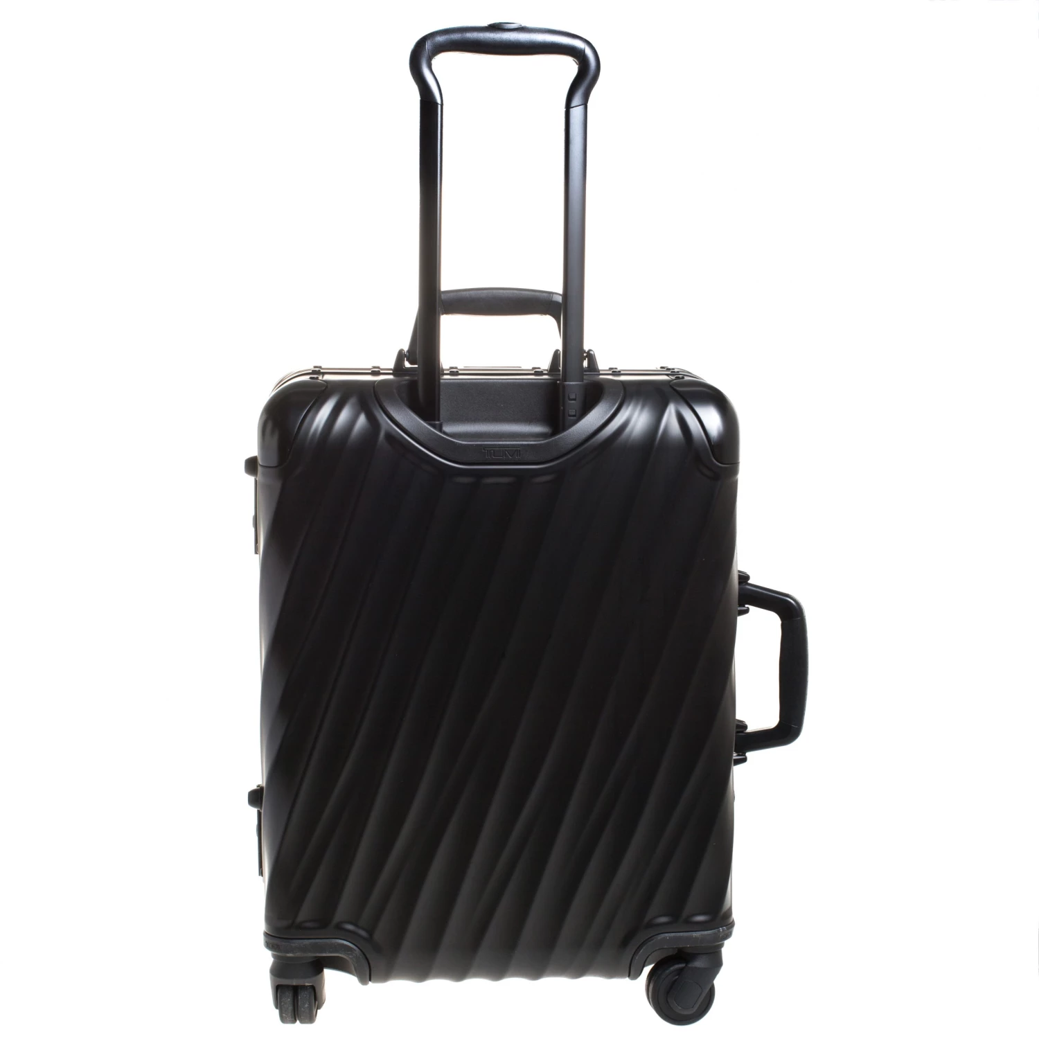 This Short Trip Packing Case 19 Degrees Luggage 55 bag from TUMI is made from black aluminium. Equipped with four wheels that offer unrestrained movement, the bag has a top carry handle. It boasts a nylon-lined spacious interior that has multiple zipped pockets for accessories and tie-down straps. Complete with a trolley handle, this is the perfect companion for those long vacations, where you want to pack like everything you have.
