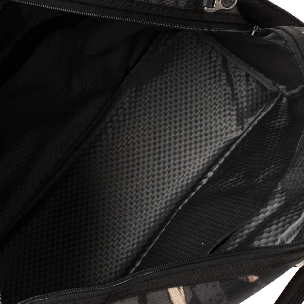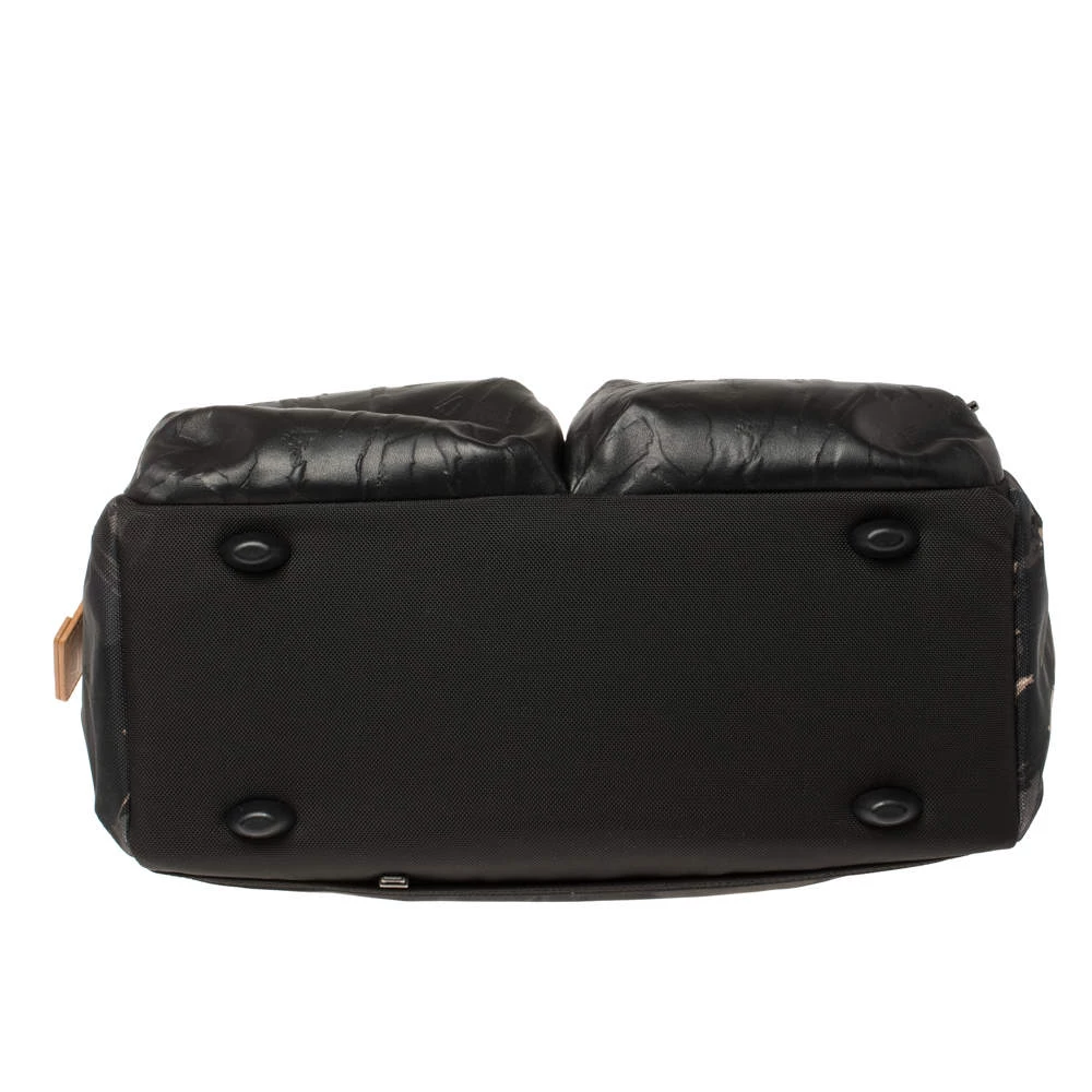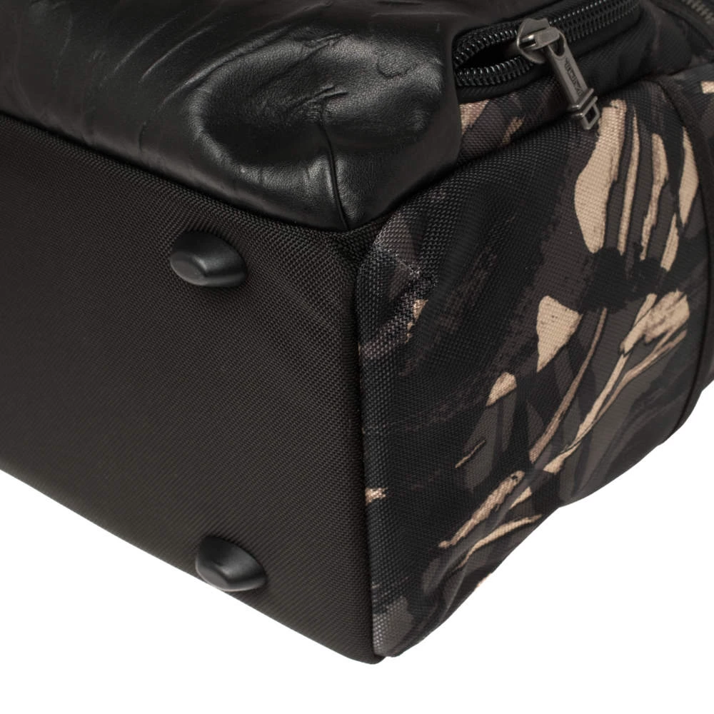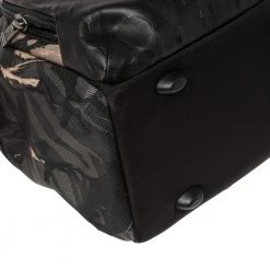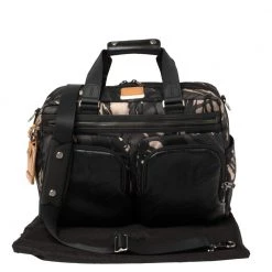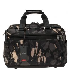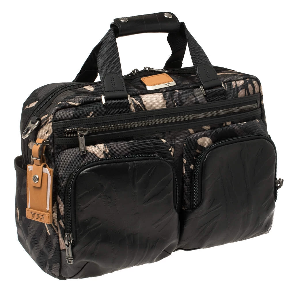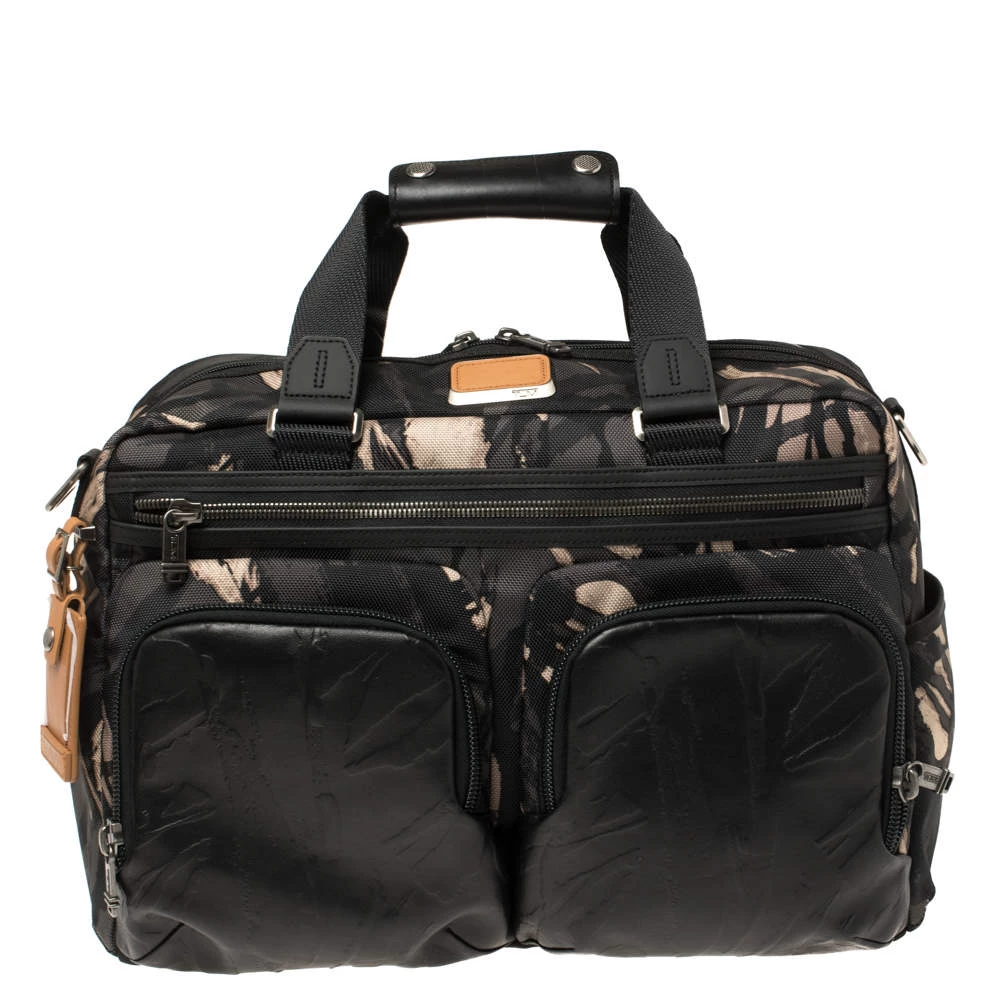 Trust this TUMI satchel to offer functional ease and a comfortable carrying experience. Crafted beautifully using fabric and leather, the bag has Camouflage prints, multiple pockets, and a name tag on the exterior. It is equipped with two handles, an adjustable shoulder strap, and a spacious fabric interior.