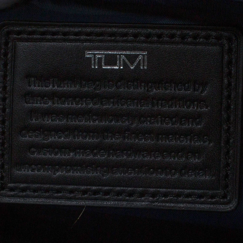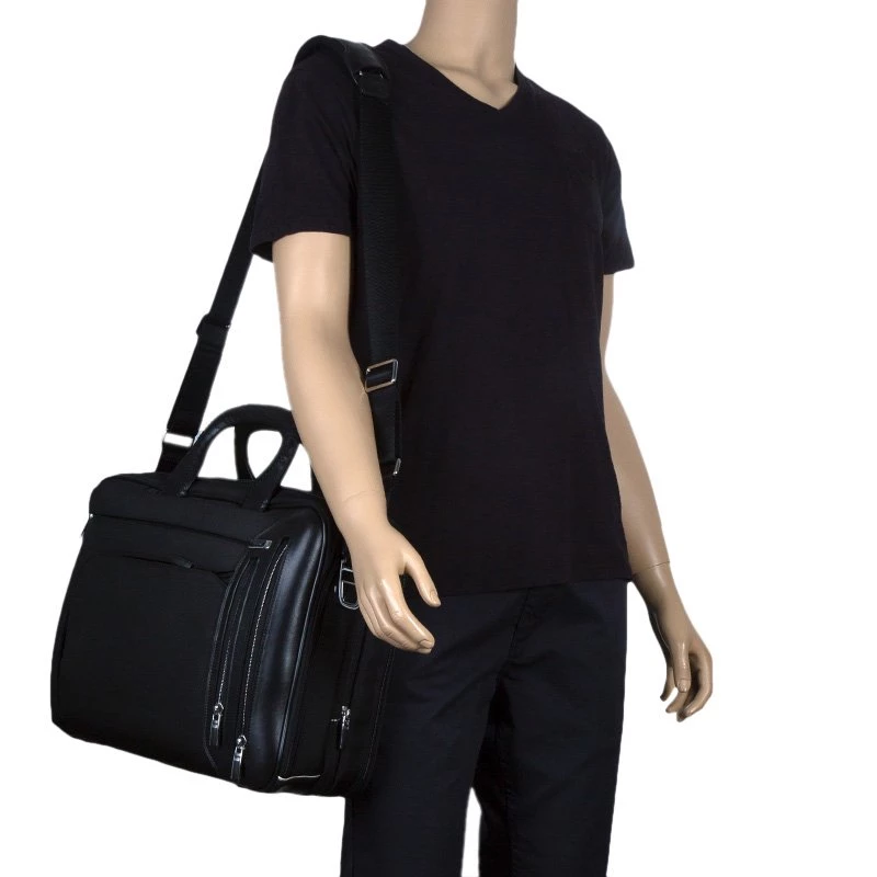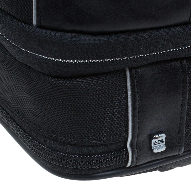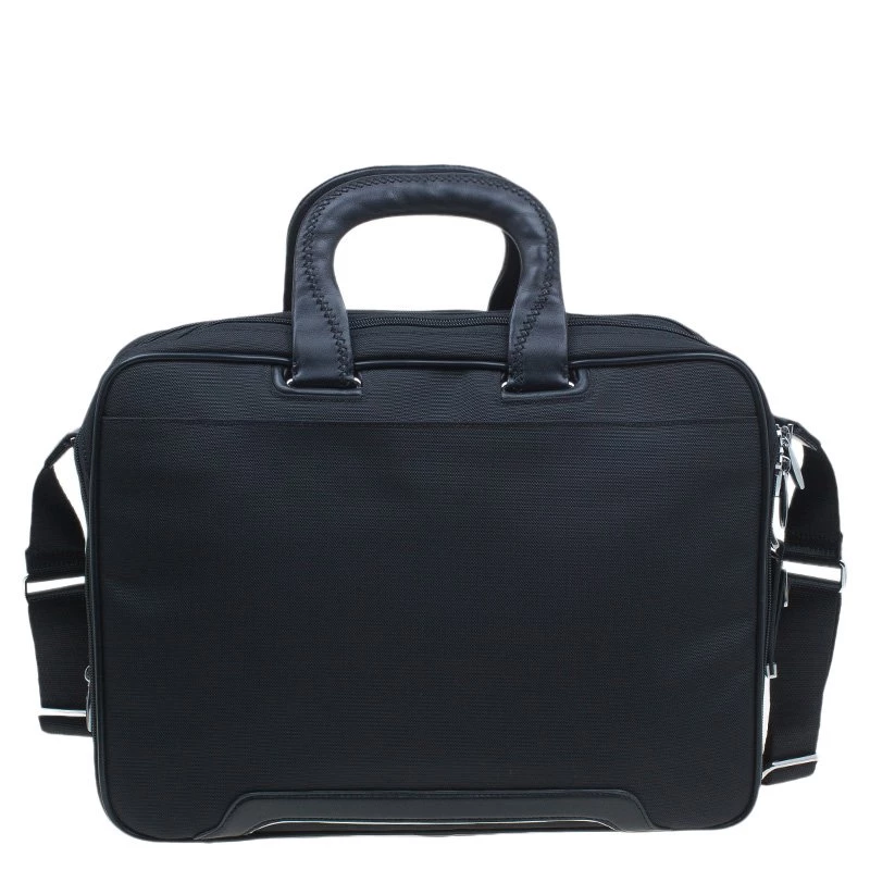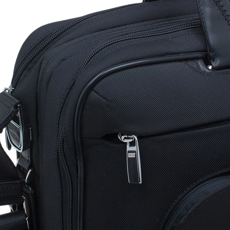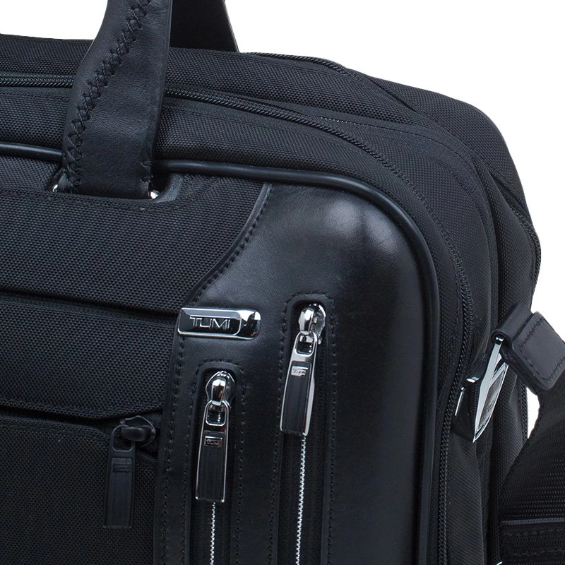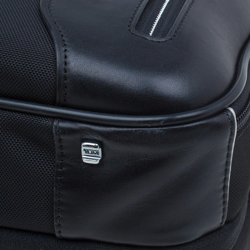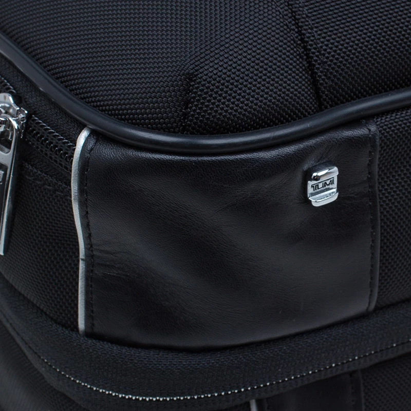 This Tumi laptop bag will carry all your essentials, whether headed to class or traveling around the world. Made from black canvas, its durable design features four front zipped pockets, one back slip pocket, double top leather handles, and two top zipped compartments. Its interior is lined with nylon and features two compartments to fit your laptop and other documents, as well as patch pockets.