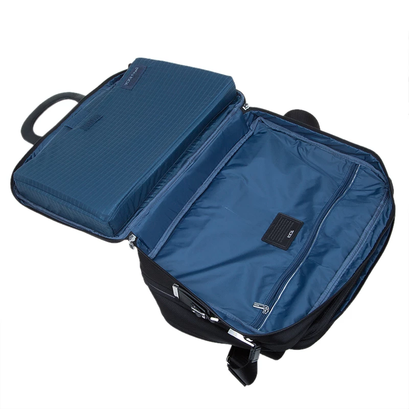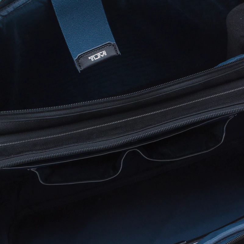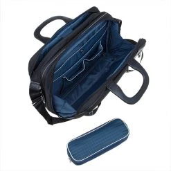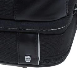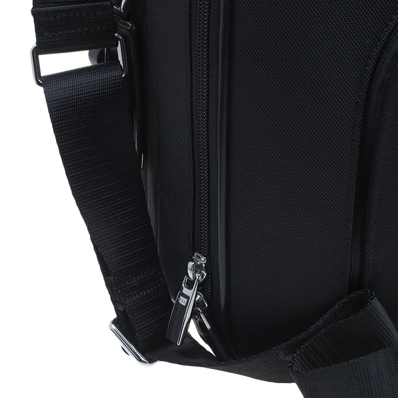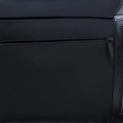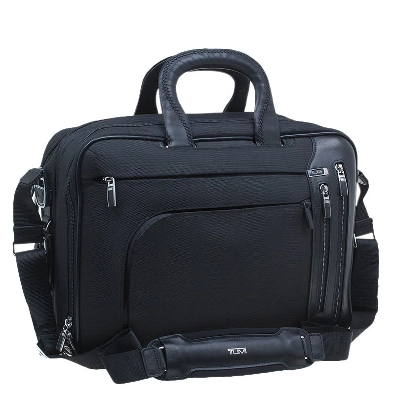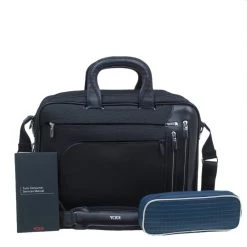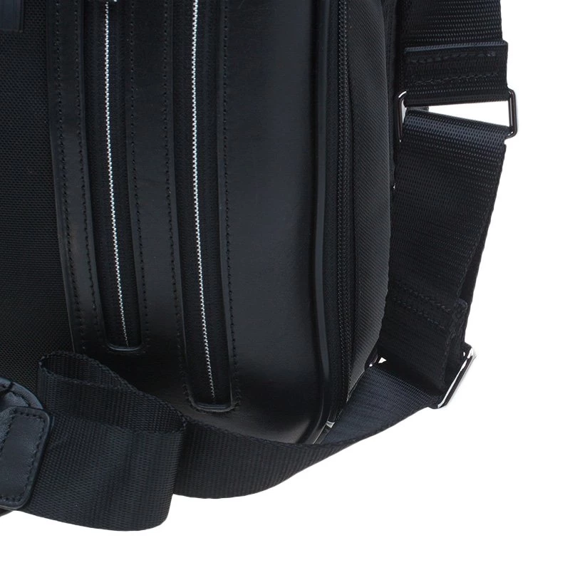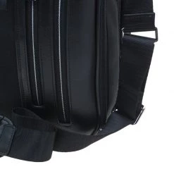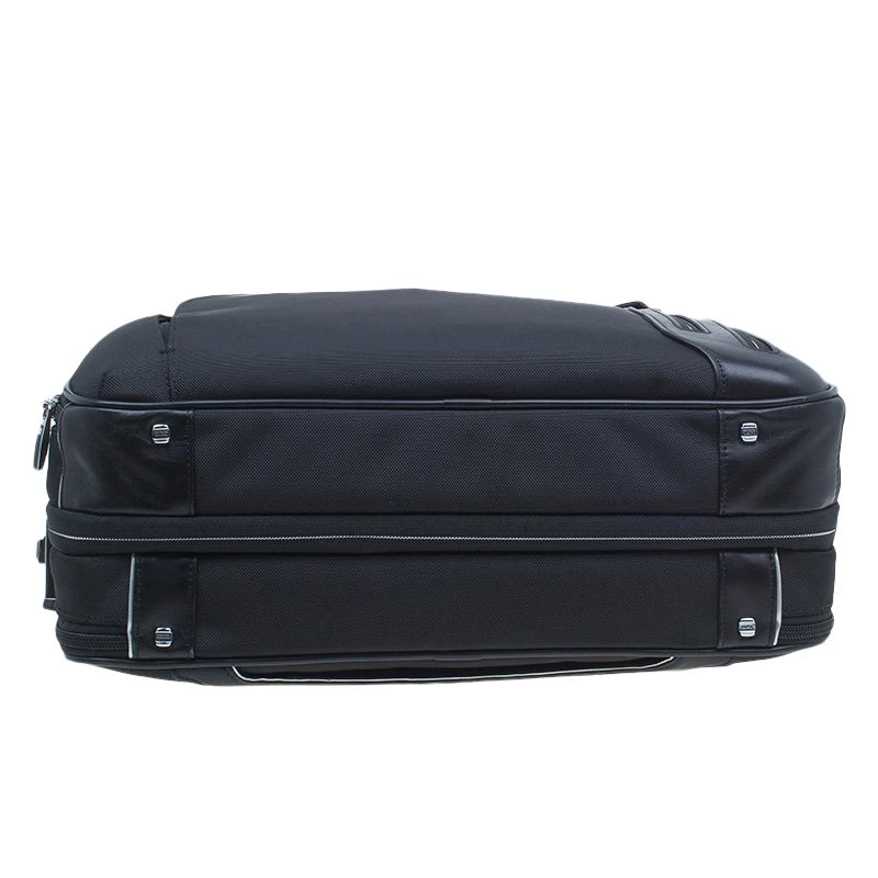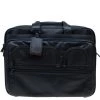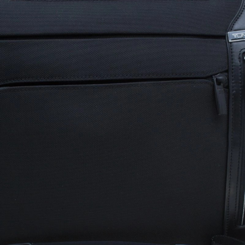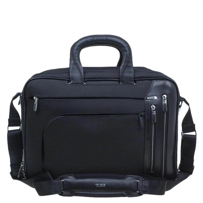 This Tumi laptop bag will carry all your essentials, whether headed to class or traveling around the world. Made from black canvas, its durable design features four front zipped pockets, one back slip pocket, double top leather handles, and two top zipped compartments. Its interior is lined with nylon and features two compartments to fit your laptop and other documents, as well as patch pockets.