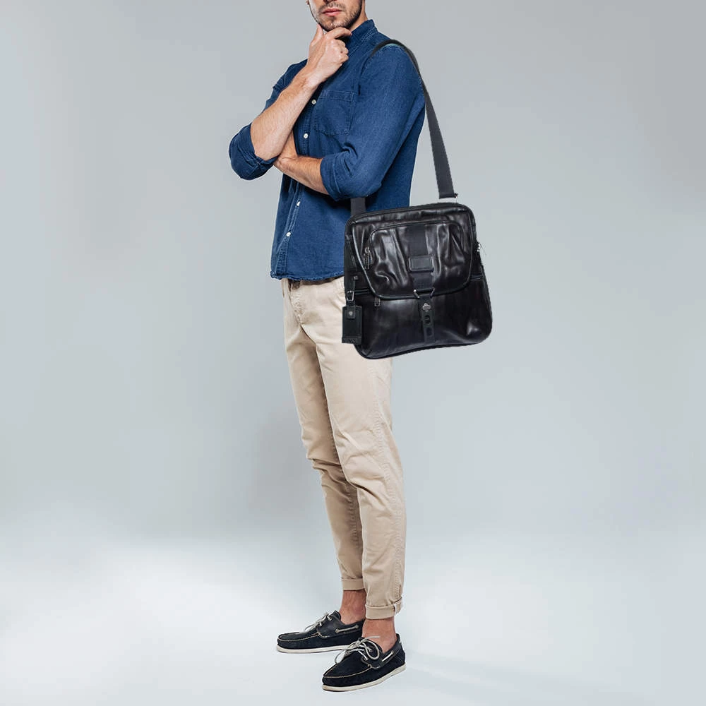 Trust this TUMI messenger bag to offer functional ease and a comfortable carrying experience. Crafted beautifully using leather, the bag has multiple pockets and a tag. It is equipped with an adjustable shoulder strap and a spacious fabric interior.
