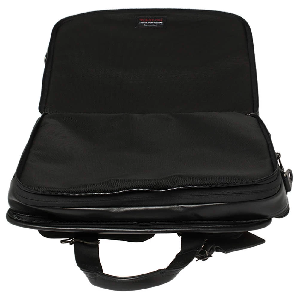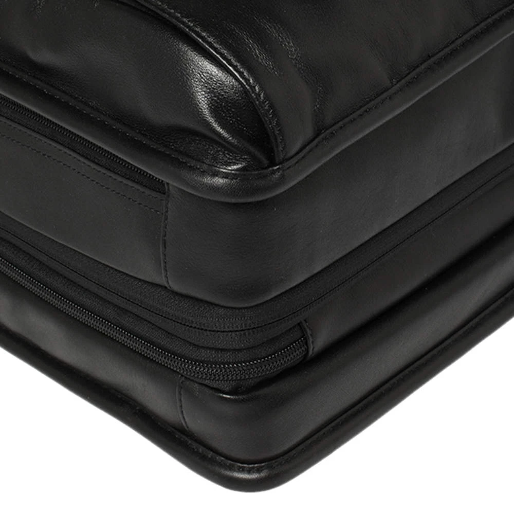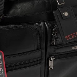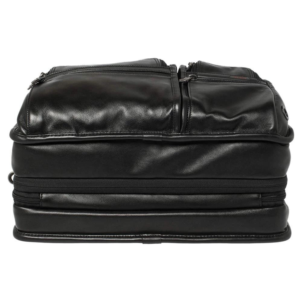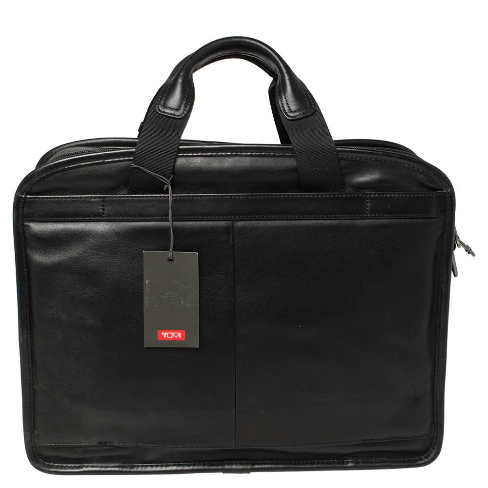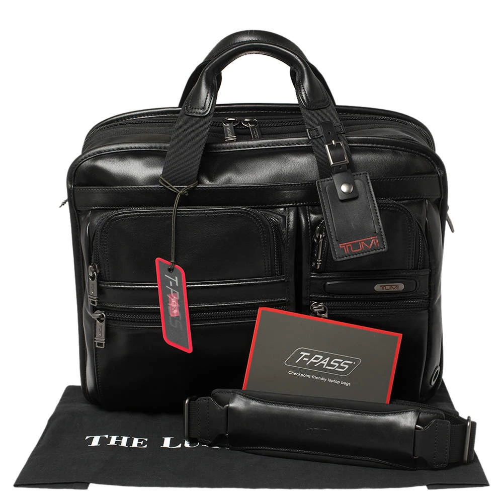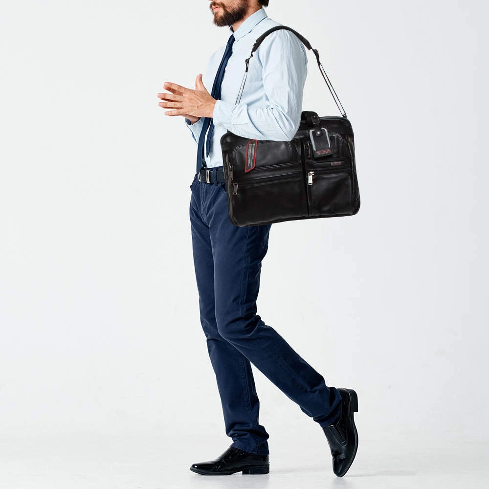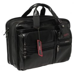 Employing high-grade materials and innovative construction to deliver impeccable products that aim at functional ease, TUMI is the brand travelers can trust. This expandable laptop briefcase is crafted in leather and equipped with multiple pockets, spacious compartments, a TUMI tag, and black-tone hardware. It is held by two handles and a shoulder strap.