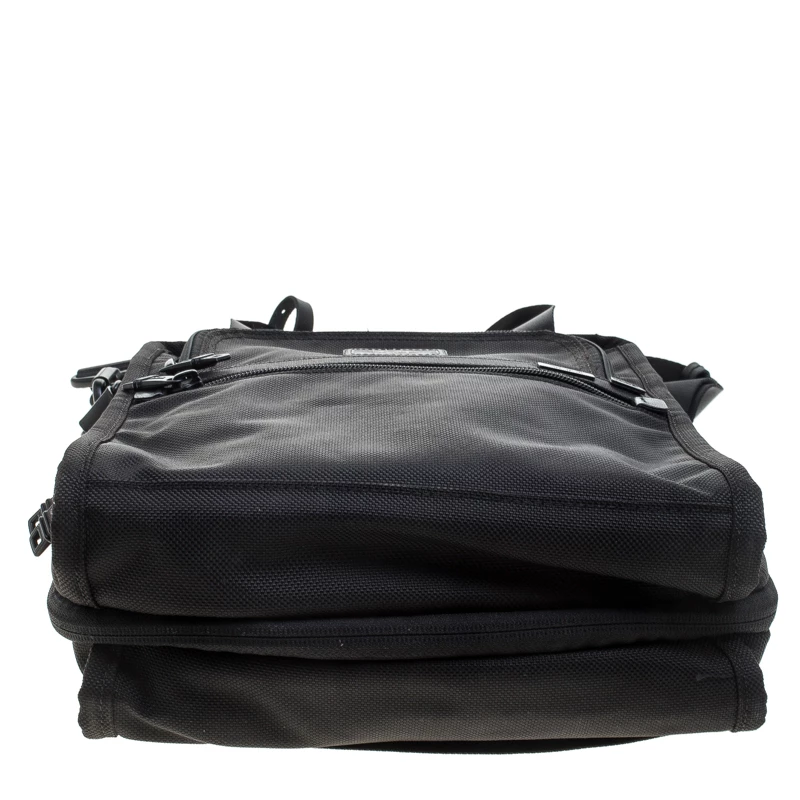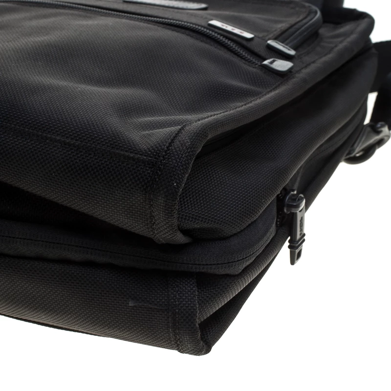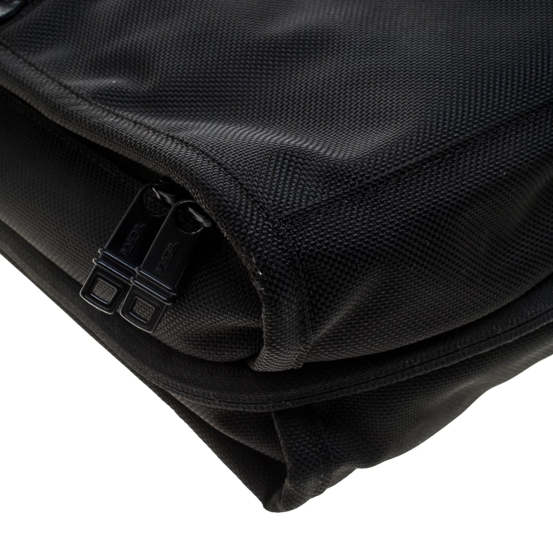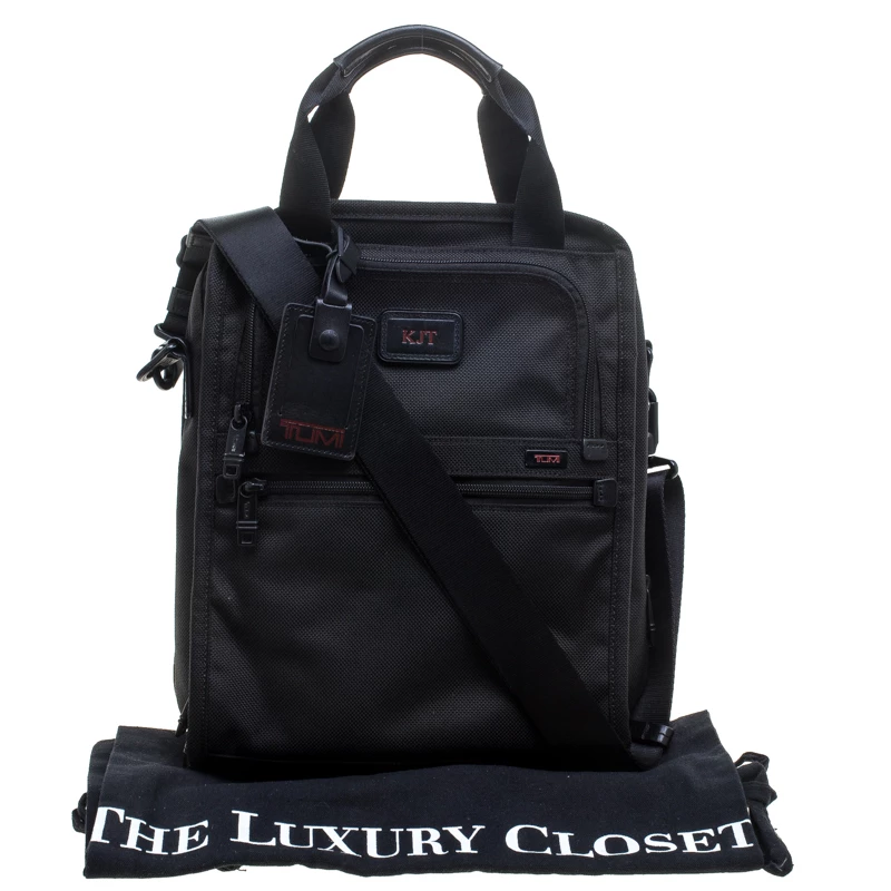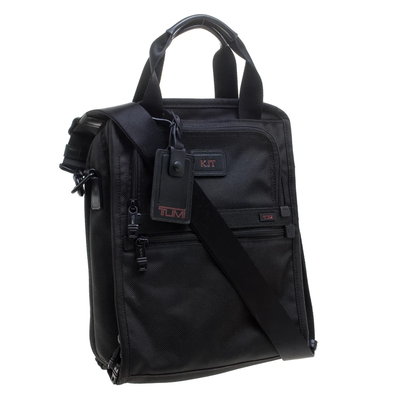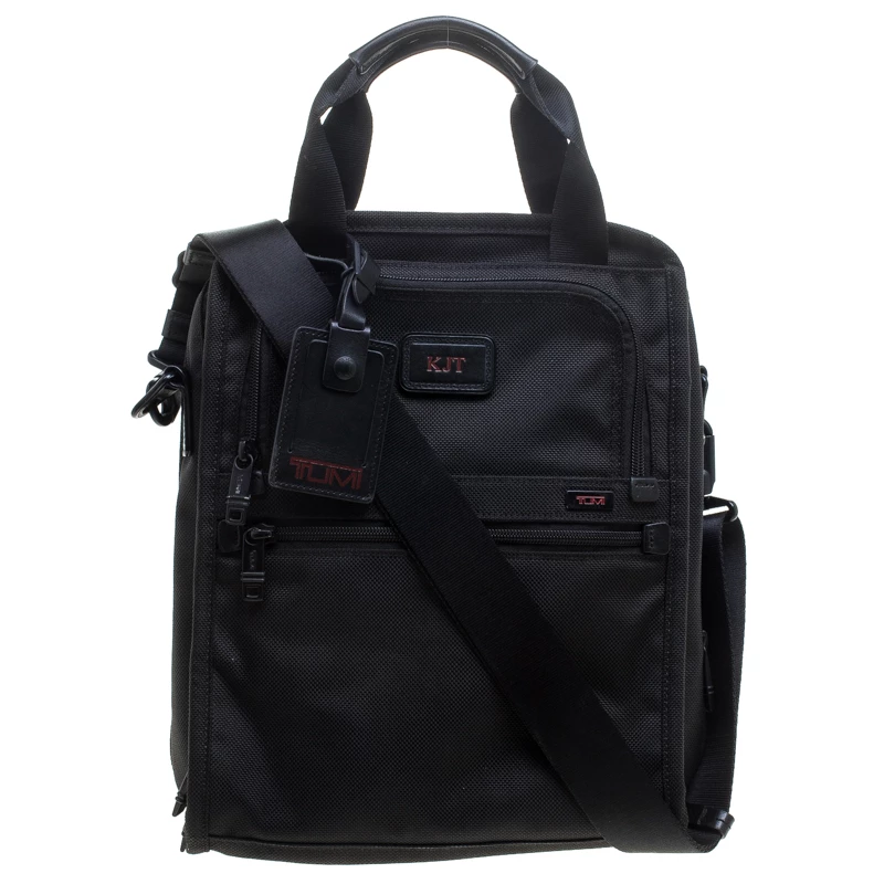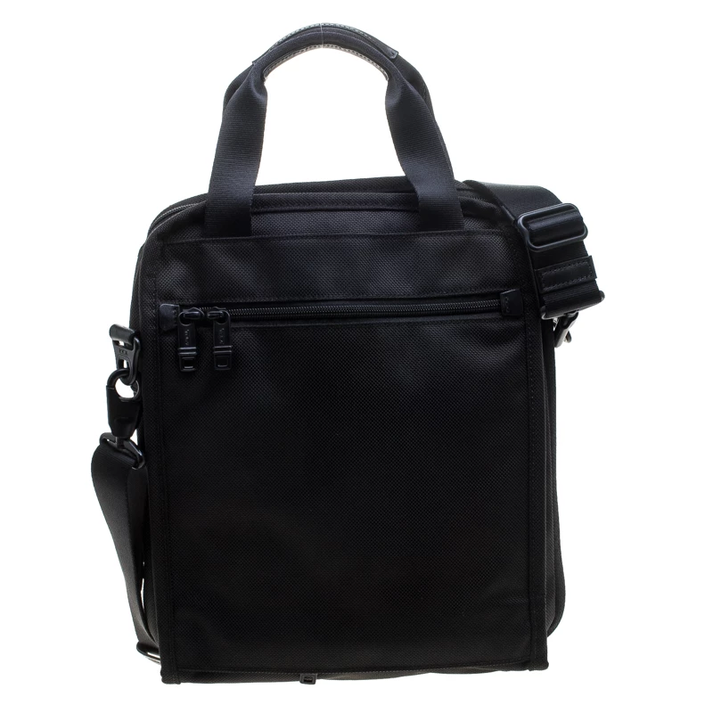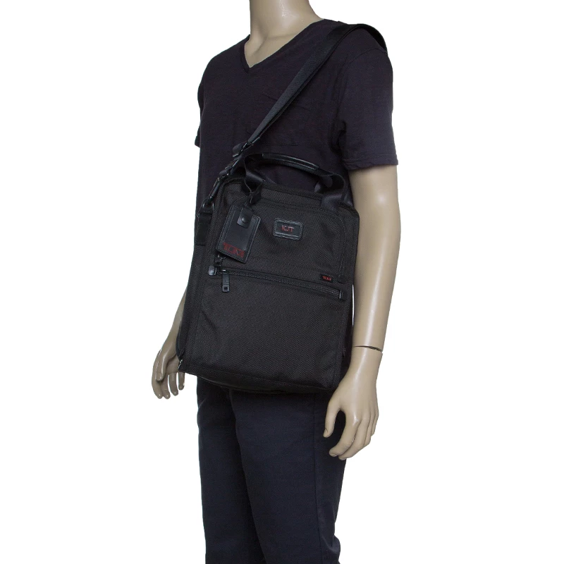 For the men on the go, this Alpha II tote from TUMI is ideal when travelling. It is crafted with black nylon and features dual top handles and a detachable shoulder strap along with zipper pockets on both the front and back exterior. The top zipper opens to a nylon-lined spacious interior that can hold more than your basics. It is complete with a brand logo tag dangling to the front.