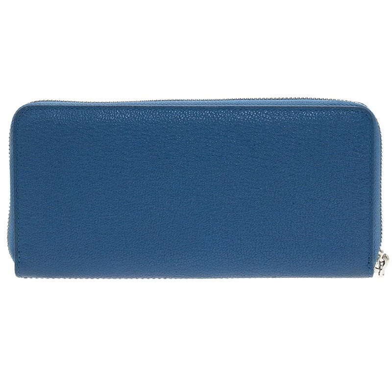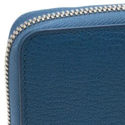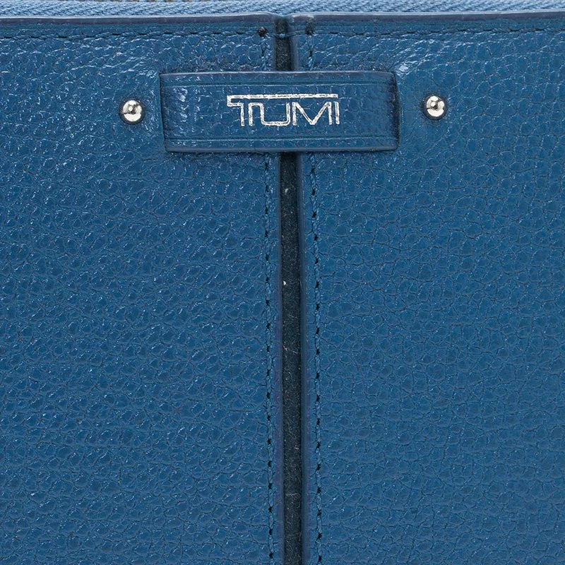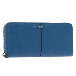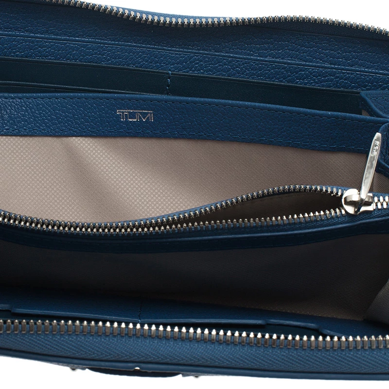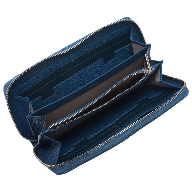 Crafted in textured blue leather, this sophisticated continental wallet is a classic accessory to be carried in hand or handbag. It features zip around closure with brand name and is accented with stitched details. The leather lined interior has two compartments with zipped pocket and 12 card slots.