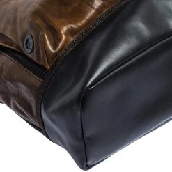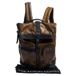 This stunning TUMI backpack will come in handy for daily use or as a style statement. It is crafted from brown leather and designed with black trims, zip pockets on the front and a flap that leads to a spacious interior lined with nylon. Two shoulder straps and a small top handle make it ready to be yours.