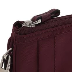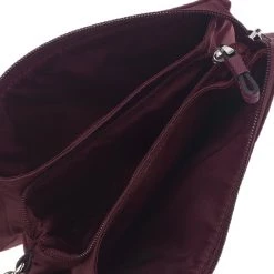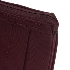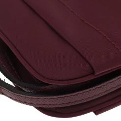 Store your beauty products in this compact pouch by Tumi. Made from burgundy nylon, the exterior comes with a leather label with heat-embossed brand’s logo and features a pleated design. It is equipped with a top zipper closure and a detachable wristlet or a strap. It opens to a three compartment interior and houses a zip pocket.
