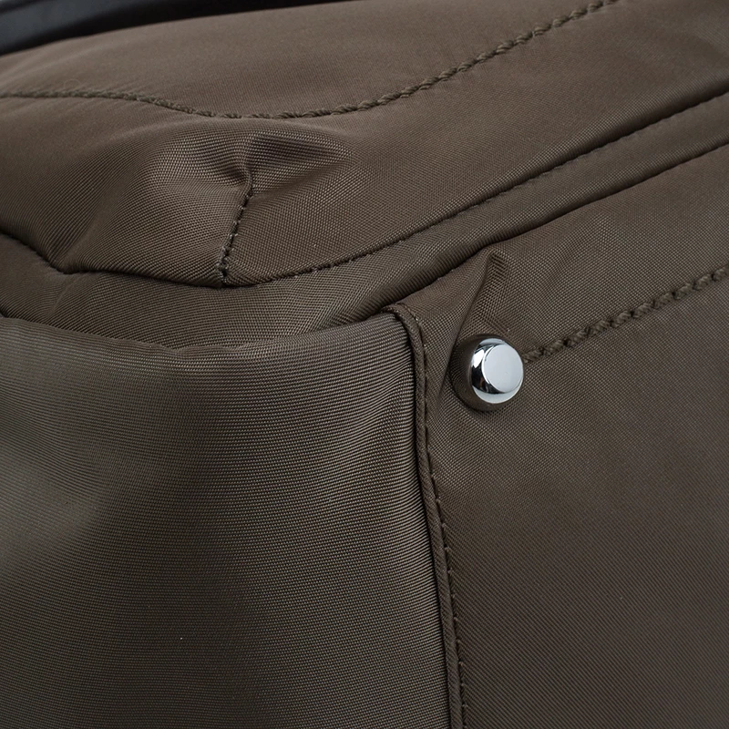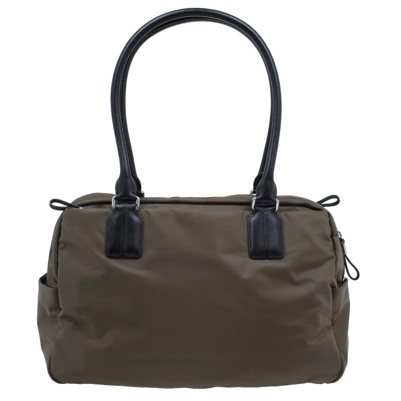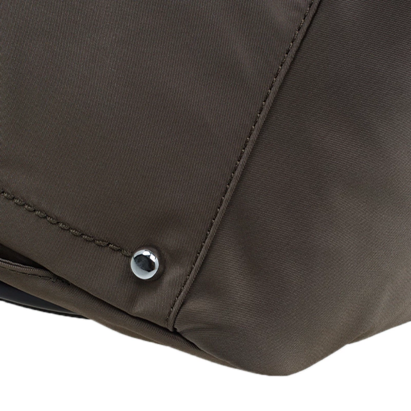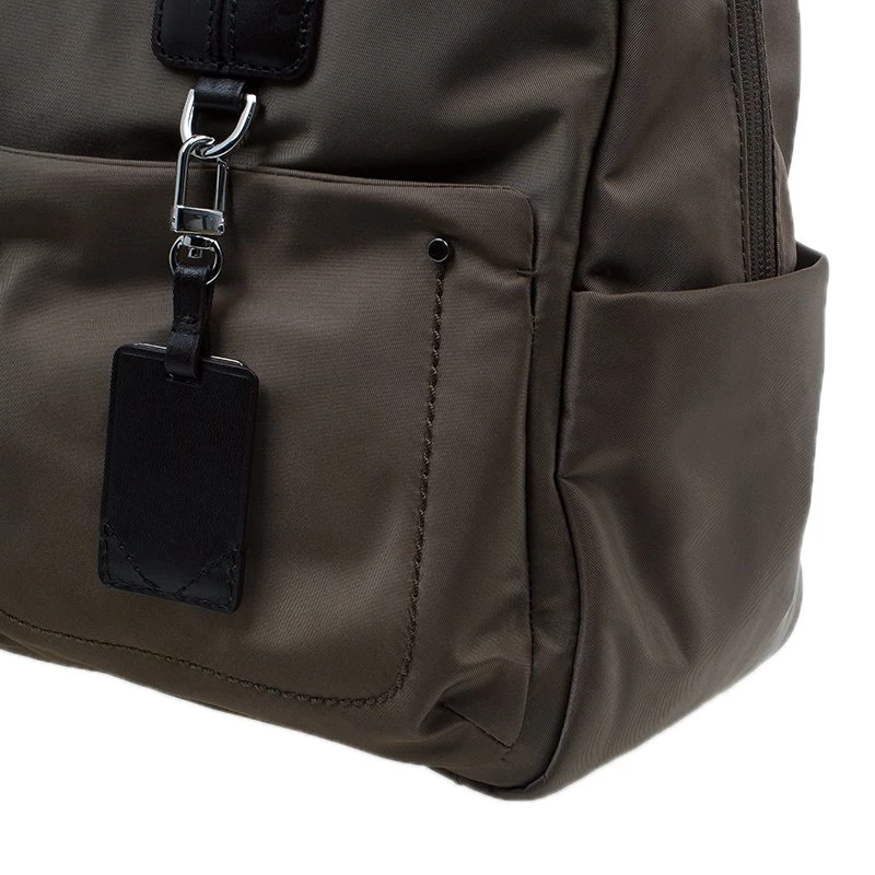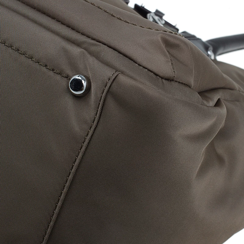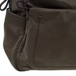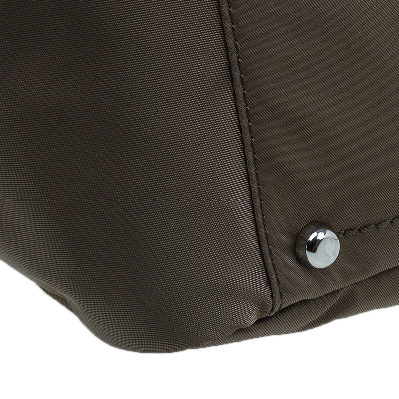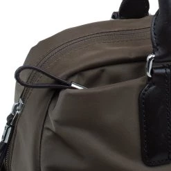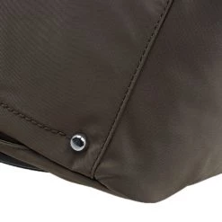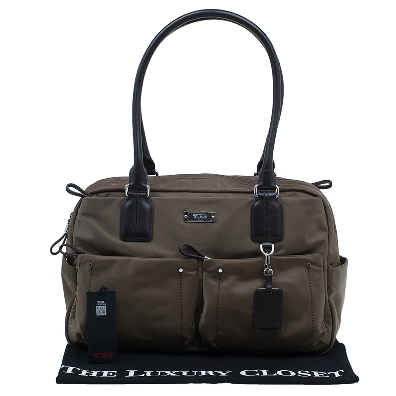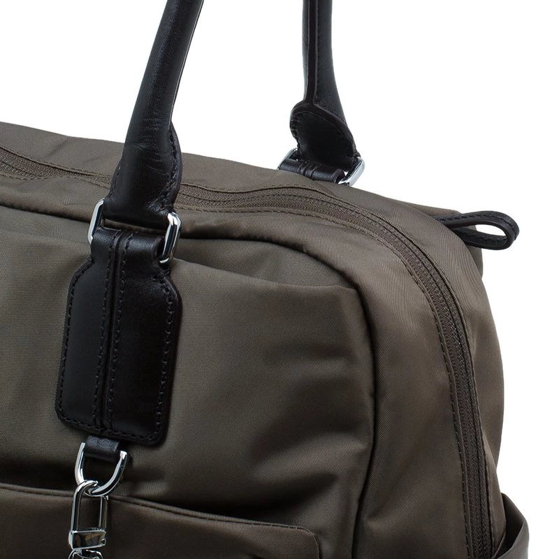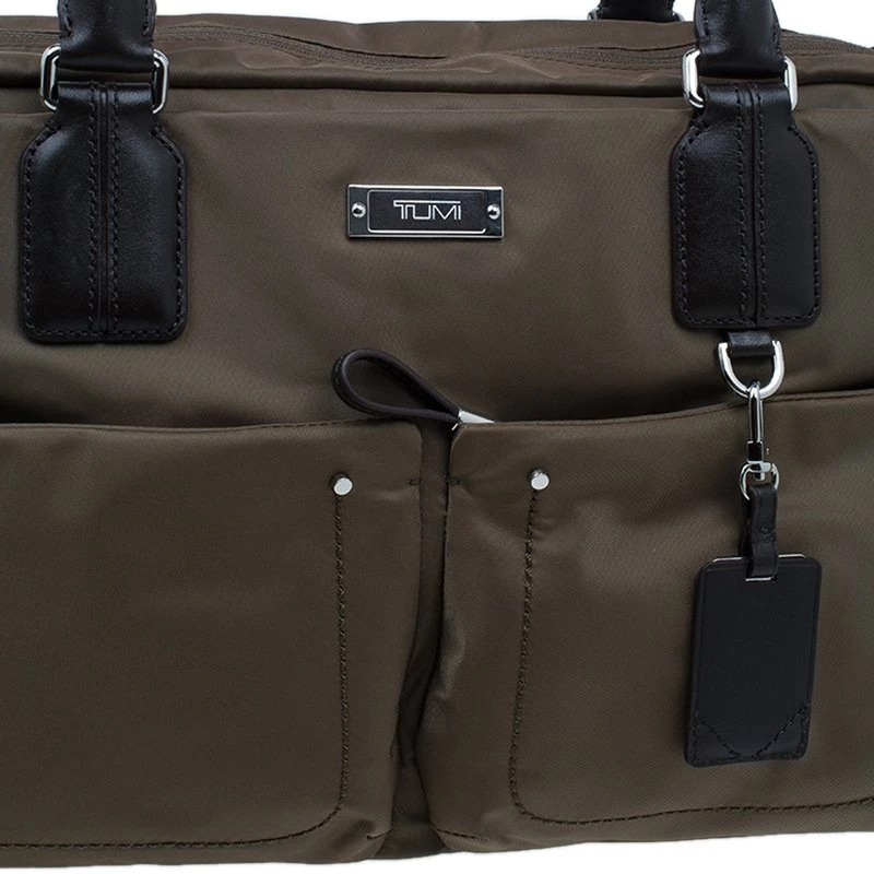 From the house of TUMI, this exclusive carry all bag has been beautifully crafted in green nylon. It features leather top handles and two front pockets. The feet come secured with studs. The top zipper closure opens to a roomy nylon lined interior. This Voyager Geneva bag is truly extravagant. It can be attached to a carry on luggage and has a detachable mirror functionality