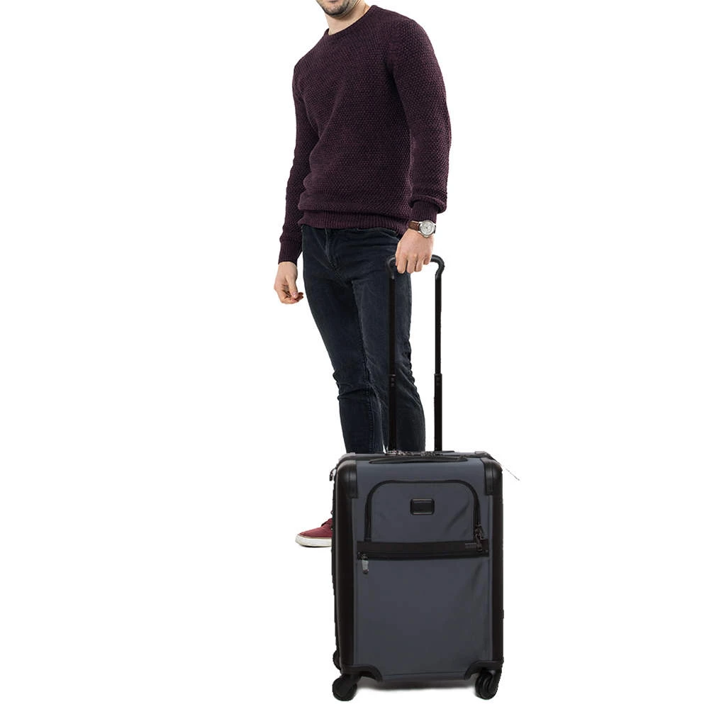 This Alpha II luggage bag is designed by TUMI in a grey-black combination. This 4 wheeled luggage case features a big and one small zipper compartment with the brand logo at the front. Crafted from nylon, this luxury opens to a wide nylon-lined interior with spacious pockets that ensure to house your clothes, footwear, and other essentials. Offering a great look and durability, this will be your companion on all your trips.