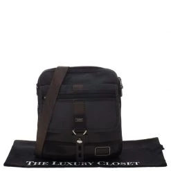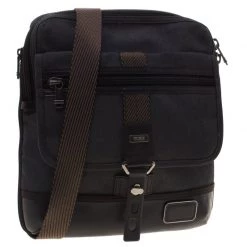 This messenger bag from Tumi is stylish and functional. Crafted from grey and brown canvas, the Alpha Bravo Annapolis bag features an adjustable shoulder strap. The front flap is accented with a zip pocket and silver tone lock closure. The interior opens to a fabric lined interior that houses a zip and a slip pocket to hold your daily necessities.